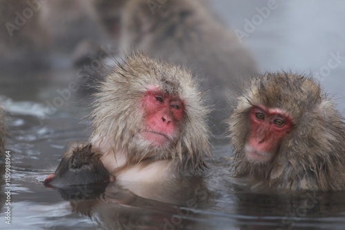 © Bossa Art, Naklejka premium Snow Monkeys Relaxing in a Hot Spring, Jigokudani, Nagano, Japan