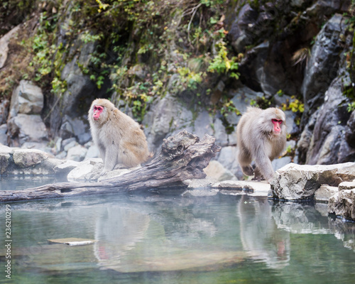 © Andrew, Obraz premium Snow monkeys with steaming onsen