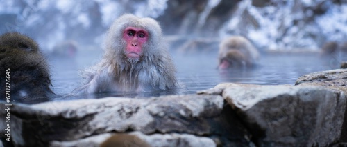 © Dismantled Productions/Wirestock Creators, Naklejka premium Snow monkeys with their family in a hot spring.