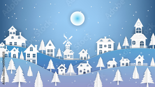 © puttikom, Fototapeta premium Snow village winter paper cut