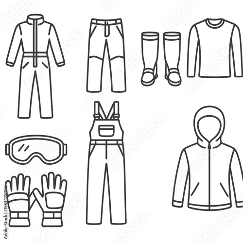 Fototapeta premium Snow Wear Icons. Outline style icons of Snow Activity Wear: ski suit, snowboard pants, snow gaiters, thermal base layer, ski