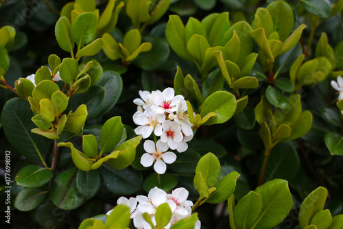 Naklejka premium Snow White Indian Hawthorn (Rhaphiolepis indica) in full bloom