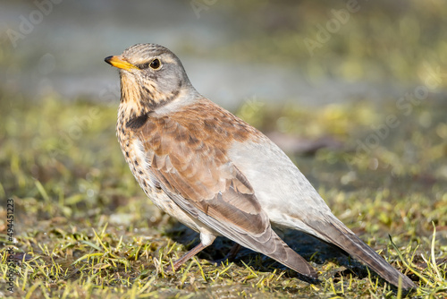 © alexbush, Fototapeta premium snowbird on the green spring grass (Turdus pilaris)