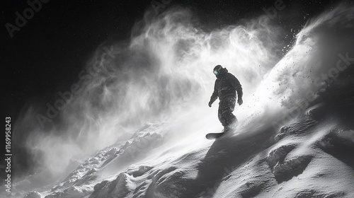 © siyons, Obraz premium Snowboarder Descending Snowy Mountain During Blizzard