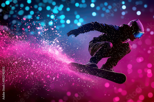 © Dadee, Naklejka premium Snowboarder in action against a colorful, dynamic background of lights and splashes.