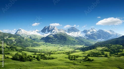 Naklejka premium Snowcapped Mountains and Lush Green Valley Landscape