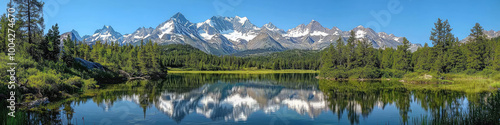 © Aidas, Fototapeta premium Snowcapped mountains lake reflection clear sky green trees