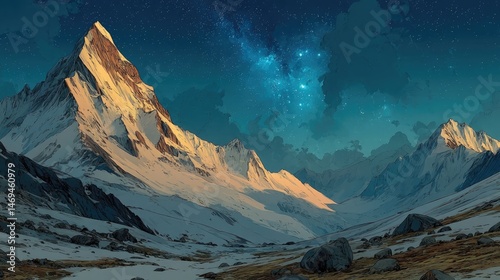 Obraz premium Snowcapped mountains under starry sky adventure majestic landscape nighttime...