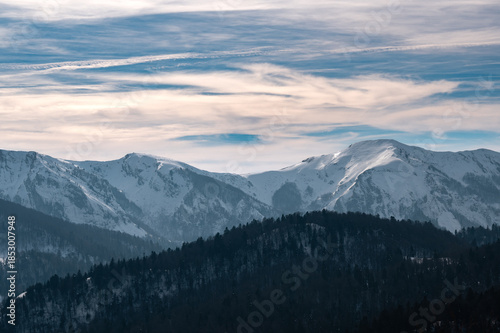 © Zoran Jesic, Fototapeta premium Snowcapped mountains with winter forest under blue sky