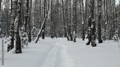 © bisonov, Fototapeta premium Snowcovered Avenue With Birch Trees, Chilly Snowlined Path Flanked With Slender White Bark Trunks, Quiet Winter Corridor Stretching Through Straightlined Birch Woods With Muted Colors
