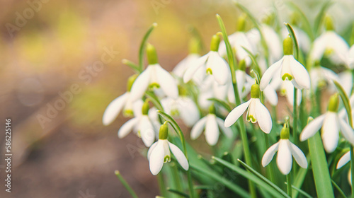 Fototapeta premium Snowdrops bloom in the garden. Selective focus.