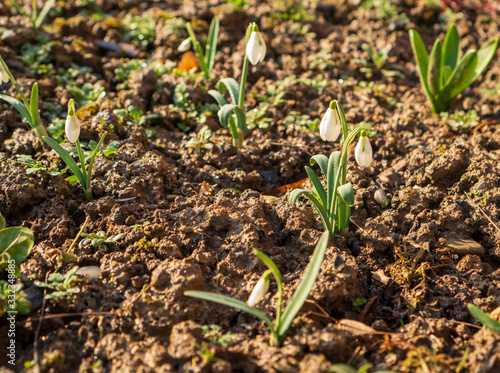 Obraz premium snowdrops in the garden in spring with brown clay around