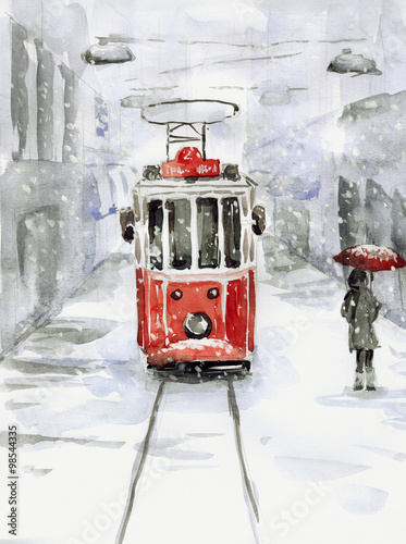 © imagination13, Obraz premium Snowfall and old tram