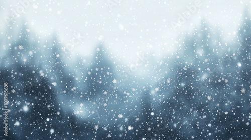 Obraz premium Snowfall in a misty forest with blurred pine trees in the background