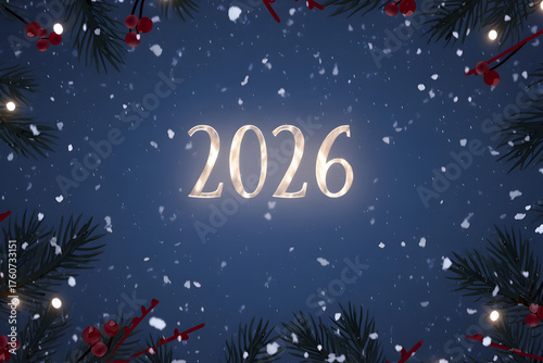 Fototapeta premium Snowfall in winter night, softly glowing ‘2026'