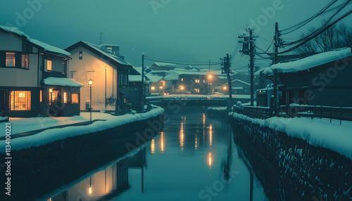 Obraz premium Snowfall Night in a Calm Japanese Village Canal