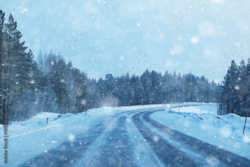 © kichigin19, Naklejka premium snowfall on a winter road, abstract background, blurred highway backdrop snowy landscape