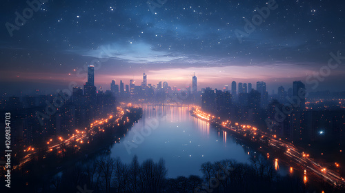 © Olena, Fototapeta premium Snowfall over a city skyline at dusk with reflections on a river and glowing street lights