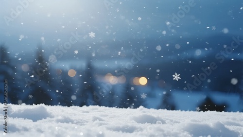 Fototapeta premium Snowfall Over a Winter Landscape with Softly Lit Background