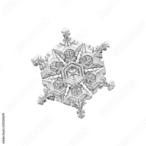 © Alexey Kljatov, Naklejka premium Snowflake isolated on white background. Macro photo of real snow crystal: elegant star plate with hexagonal symmetry, glossy relief surface, massive central hexagon and short, ornate arms.