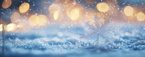 Naklejka premium Snowflake resting on glittering snow with bokeh