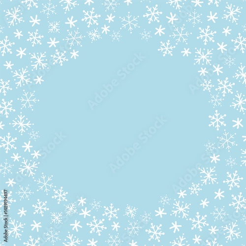 Fototapeta premium Snowflake Round Frame. Beautiful Winter Holiday Background. Christmas Greeting Card Template. Invitation. Free Space for Your Text. Vector Illustration in Light Blue, White.