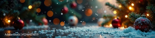 © AiGallery, Naklejka premium Snowflakes fall gently on festive Christmas decorations, lights, garland