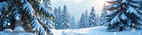 Naklejka premium Snowflakes fall softly through coniferous trees, frosty pines, frozen landscape