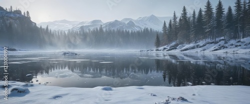 Fototapeta premium Snowflakes falling gently in front of a frozen lake, winter scene, cold...