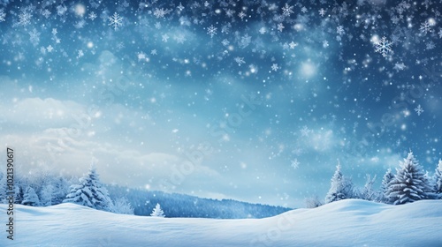© somporn, Fototapeta premium Snowflakes falling gently on a snowy hillside