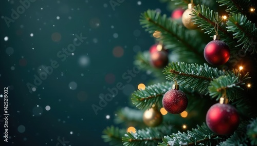 Obraz premium Snowflakes falling on a decorated Christmas tree, holiday, holly