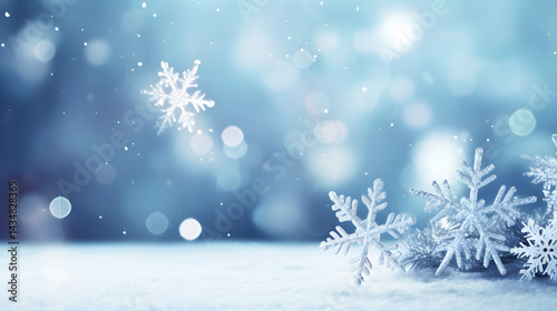© Khan, Naklejka premium Snowflakes falling on a snowy surface with a blurred background.