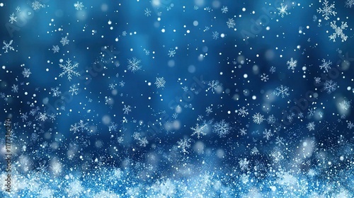 Fototapeta premium Snowflakes falling on blue background, winter wonderland backdrop.