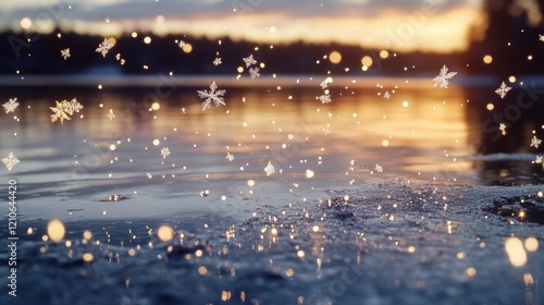 Naklejka premium Snowflakes falling onto calm lake surface
