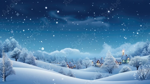 Fototapeta premium Snowflakes gently fall from a starry sky, covering homes in a shimmering white blanket, creating a picturesque Christmas scene.