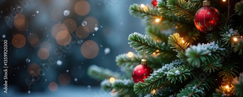 Fototapeta premium Snowflakes gently falling on a festive Christmas tree, decorations, ornaments