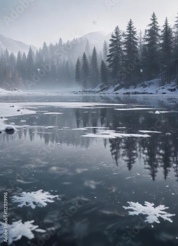 Fototapeta premium Snowflakes gently falling on a frozen lake during Christmas Day, lake, peaceful