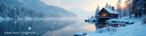 © yuwaree, Fototapeta premium Snowflakes gently falling on a frozen lake near the cottage, lake, cold, serene