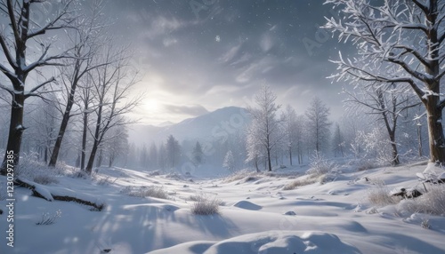 Obraz premium Snowflakes gently falling on a winter landscape, winter scene, peaceful...