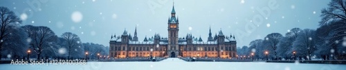 © chaiwat, Fototapeta premium Snowflakes gently falling on the parliament building, parliament building, snow