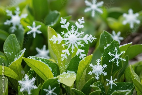 Obraz premium Snowflakes on Lush Green Leaves in Nature's Spring Awakening