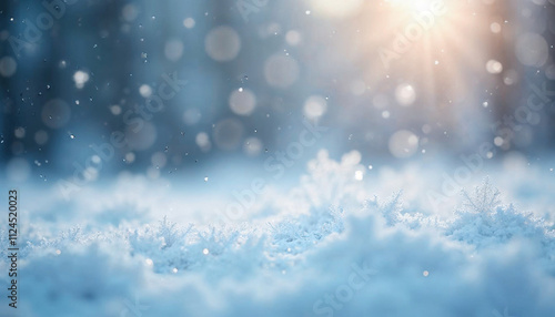 © Ali Hamza Tullah, Naklejka premium Snowflakes On Snow - Christmas And Winter Background - Natural Snowdrift Close Up With Abstract Light
