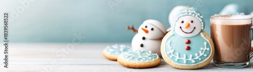 Fototapeta premium Snowman Cookie and Cocoa Scene, Holiday Baking, Winter Treat