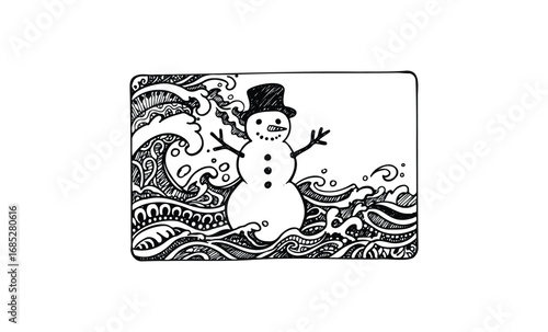 Obraz premium Snowman in abstract ocean waves with intricate patterns and black top hat. Vector retro hand drawn illustration