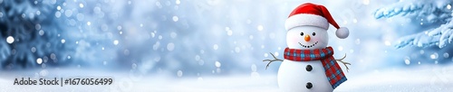 © Jack, Fototapeta premium Snowman with colorful scarf and Santa style hat surrounded by sparkling snowy landscape and frosted trees shining in sunlight.