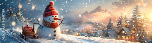 © Teeradej, Naklejka premium Snowman with Sled in Mountain Village