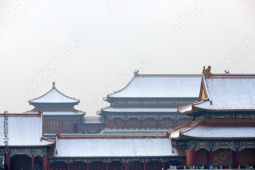 Naklejka premium Snowscape of ancient architecture in the Forbidden City, Beijing, China.