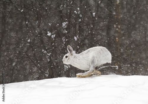Obraz premium Snowshoe hare or Varying hare (Lepus americanus) running in the falling snow...
