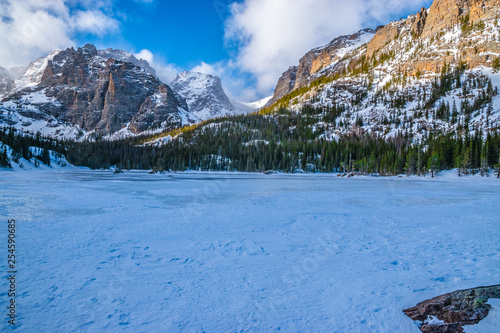 Fototapeta premium Snowshoeing to Loch Lake in Rocky Mountain National Park in Estes Park, Colorado