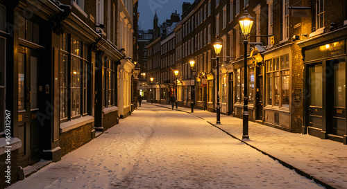 Fototapeta premium Snowy Alleyway at Night with Warm Yellow Lights